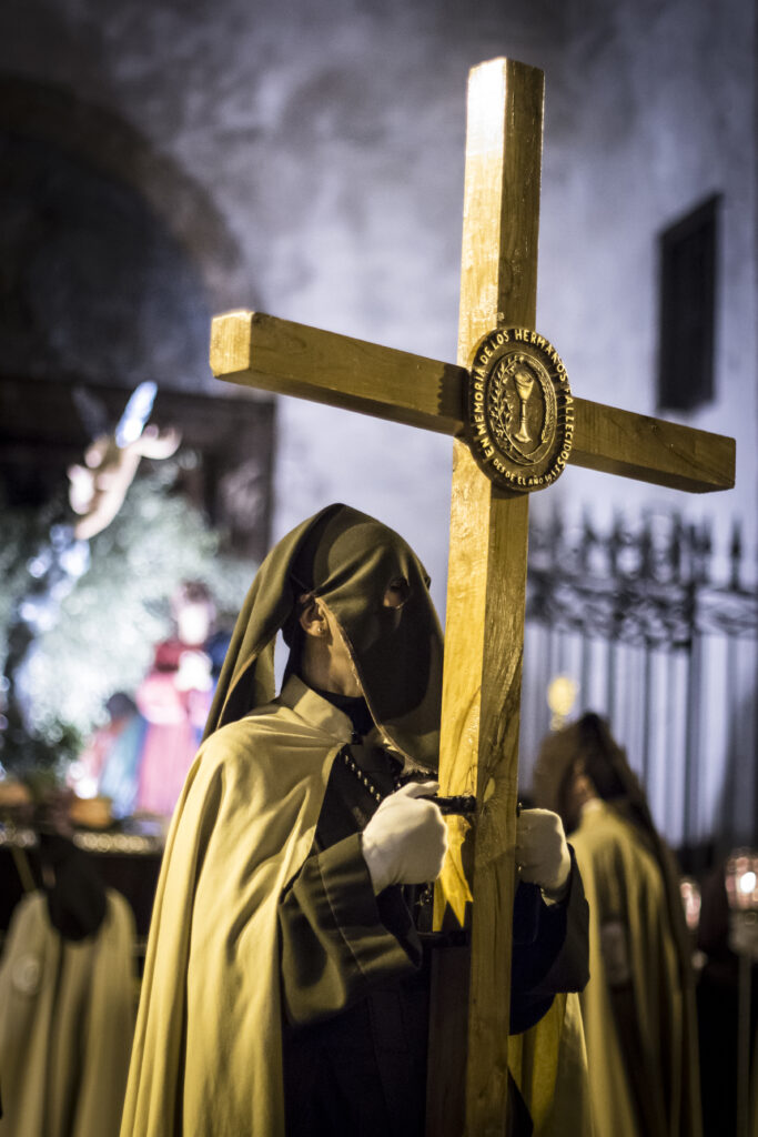 Acompañar al paso de Nuestro Sr. en la Oración del Huerto y otros pasos en Martes Santo, día titular de la Cofradía, Jueves Santo y en la procesión del Santo Entierro, o cualquier otro día que se determine.