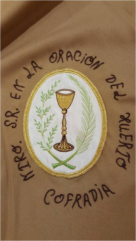 El emblema está formado por un ovalo de fondo blanco con ribete dorado. En el centro el cáliz de la amargura en oro. En campo, al lado diestro del cáliz una rama de palma en tono verde y al siniestro una de olivo del mismo tono.