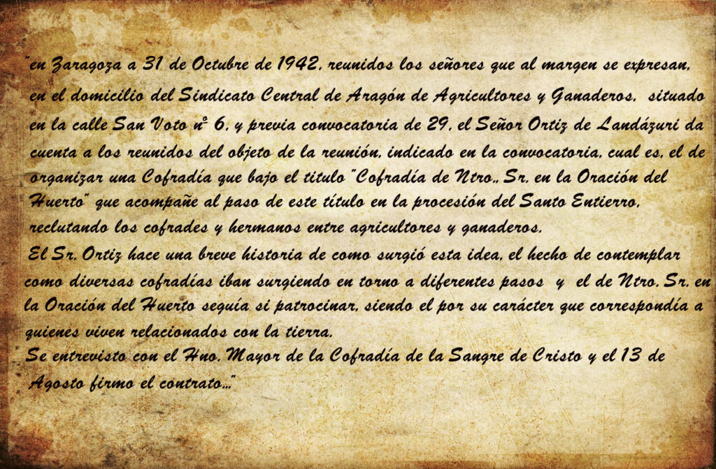 El 13 de agosto de 1.942 D. Daniel Ortiz de Landázuri Albaiza, fundador de la Cofradía firma un precontrato con el Hermano Mayor Presidente de la Muy Ilustre, Antiquísima y Real Hermandad de la Preciosísima Sangre de Nuestro Señor Jesucristo y Madre de Dios de Misericordia, en la sala Capitular de la Iglesia de Santa Isabel de Portugal. En esta reunión ya se acuerda la entrega del paso de la Oración del Huerto, en usufructo a esta recién formada Cofradía.