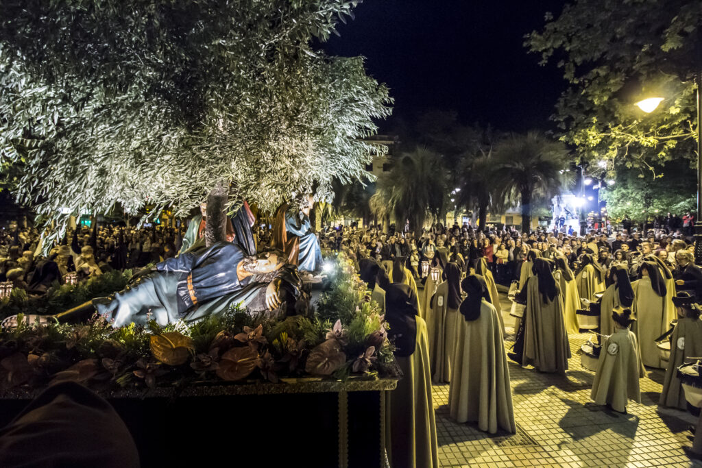 Desde la Iglesia de San Cayetano, en procesión por diferentes calles del centro de Zaragoza, la cofradía de Ntro. Sr. en la Oración del Huerto recuerdan el momento de Cristo Orando en el Huerto, la procesión se realiza con su paso titular y la peana del Santísimo Cristo Nuestro Padre Jesús de la Oración, regresando de nuevo a la Iglesia de San Cayetano dando por finalizada la procesión.